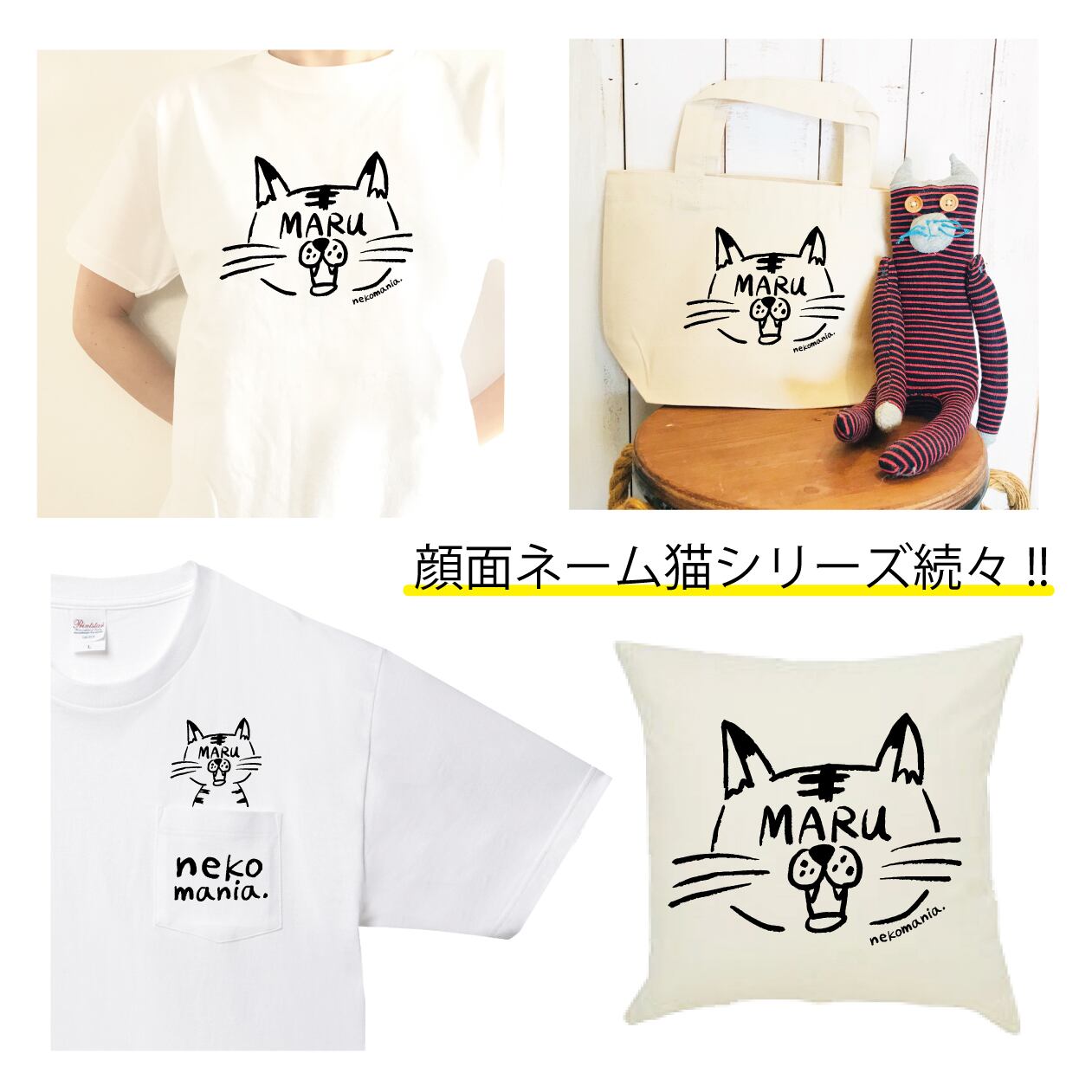 ※オーダー文字は茶色インクの猫のみです。グレー生地の猫は「NEKO」のままです。